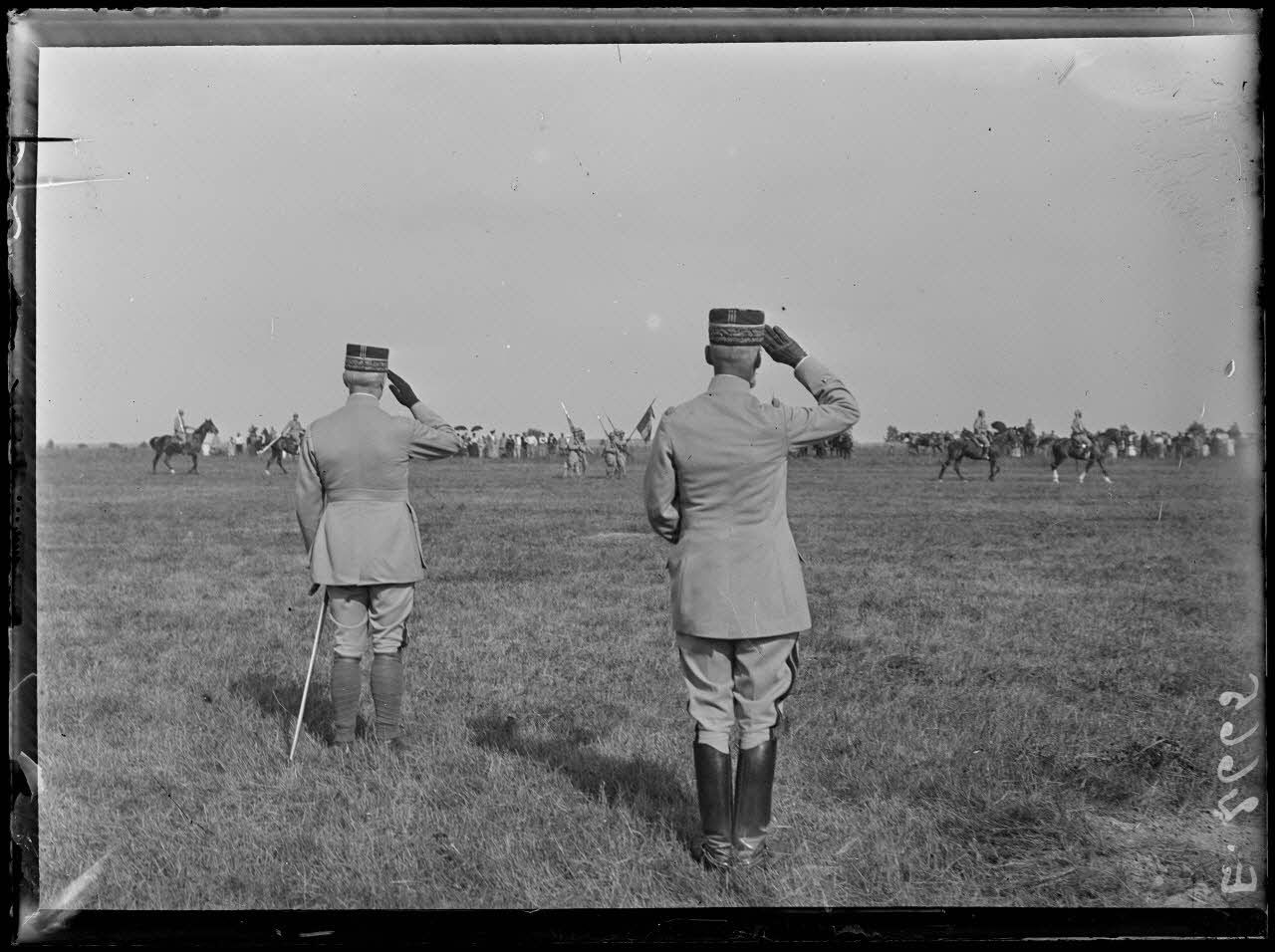 Fleury la Rivière. Marne. Revue de la 14e Division d'infanterie par le général Pétain. Les généraux Pétain et de Bazelaire pendant le défilé de cavalerie.
