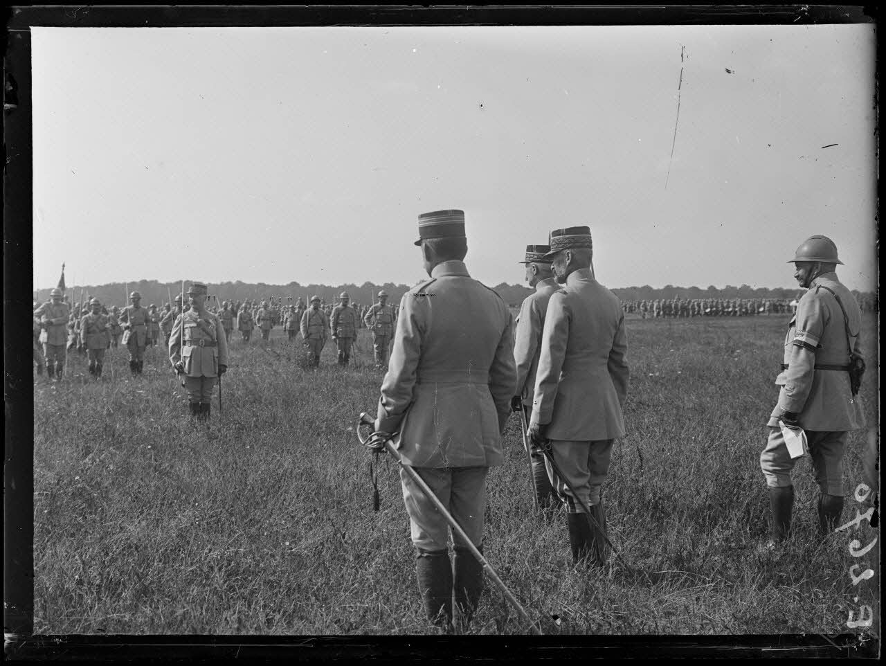 Fleury la Rivière. Marne. Revue de la 14e Division d'infanterie par le général Pétain. Le général Pétain passe devant les troupes.