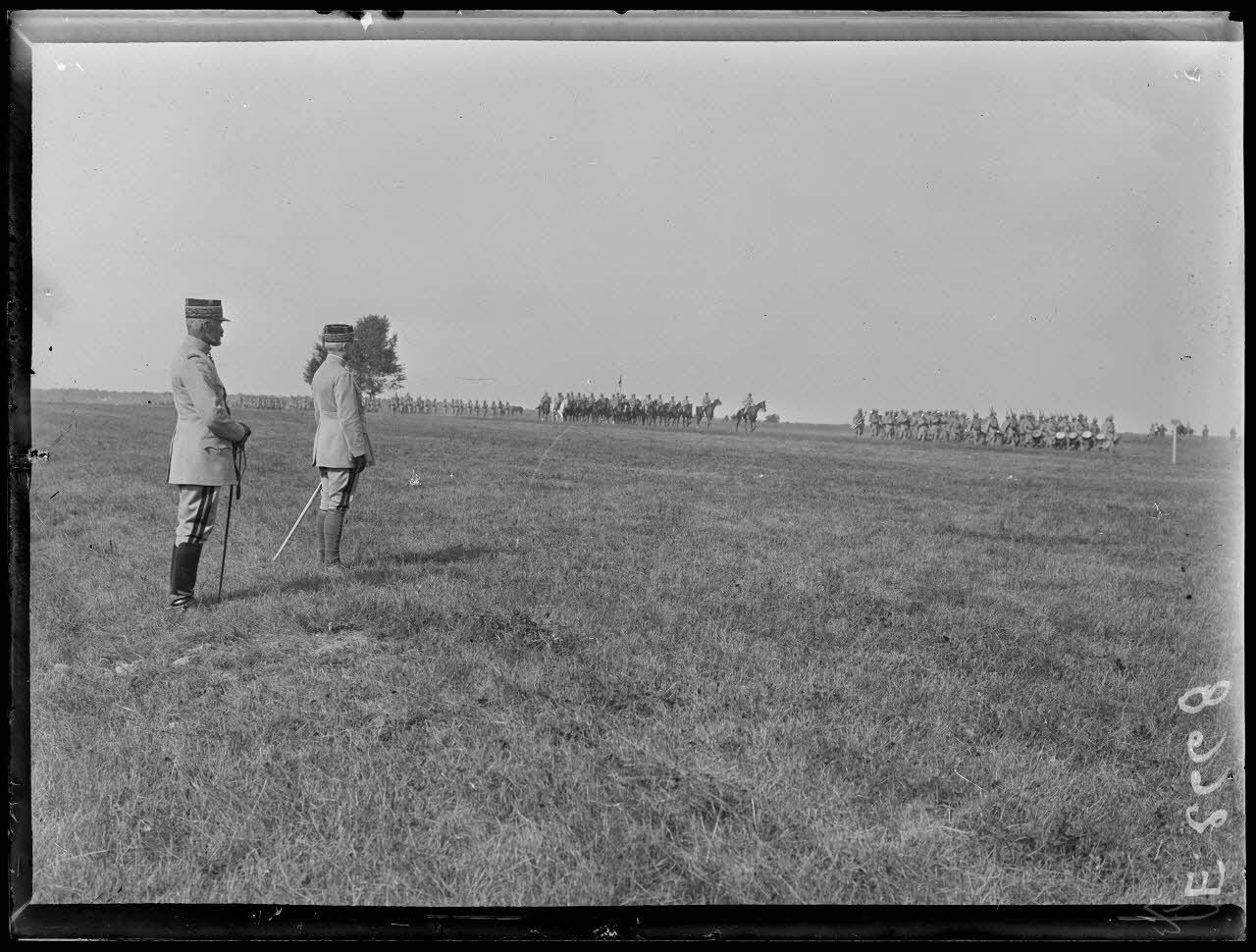Fleury la Rivière. Marne. Revue de la 14e Division d'infanterie par le général Pétain. Les généraux Pétain et de Bazelaire pendant le défilé de cavalerie.