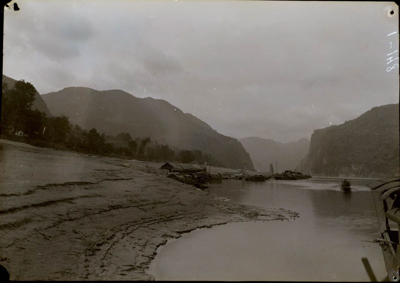 Fleuve Yang Tze Kiang. Gorges d'Itchang, station de douanes de Ping Cheng Pa à 15 kilomètres en amont d'Itchang. Vue prise sur la rive droite vers l'amont du fleuve, le 12 novembre 1888. [légende d'origine]