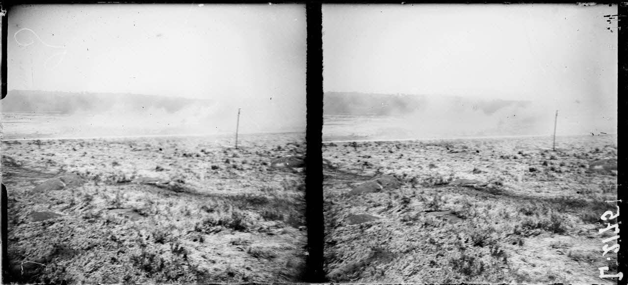 Fontainebleau. Seine et Marne. Expérience de tirs d'obus asphyxiants sur des tranchées avec chiens. Le gaz commence à couvrir le terrain.