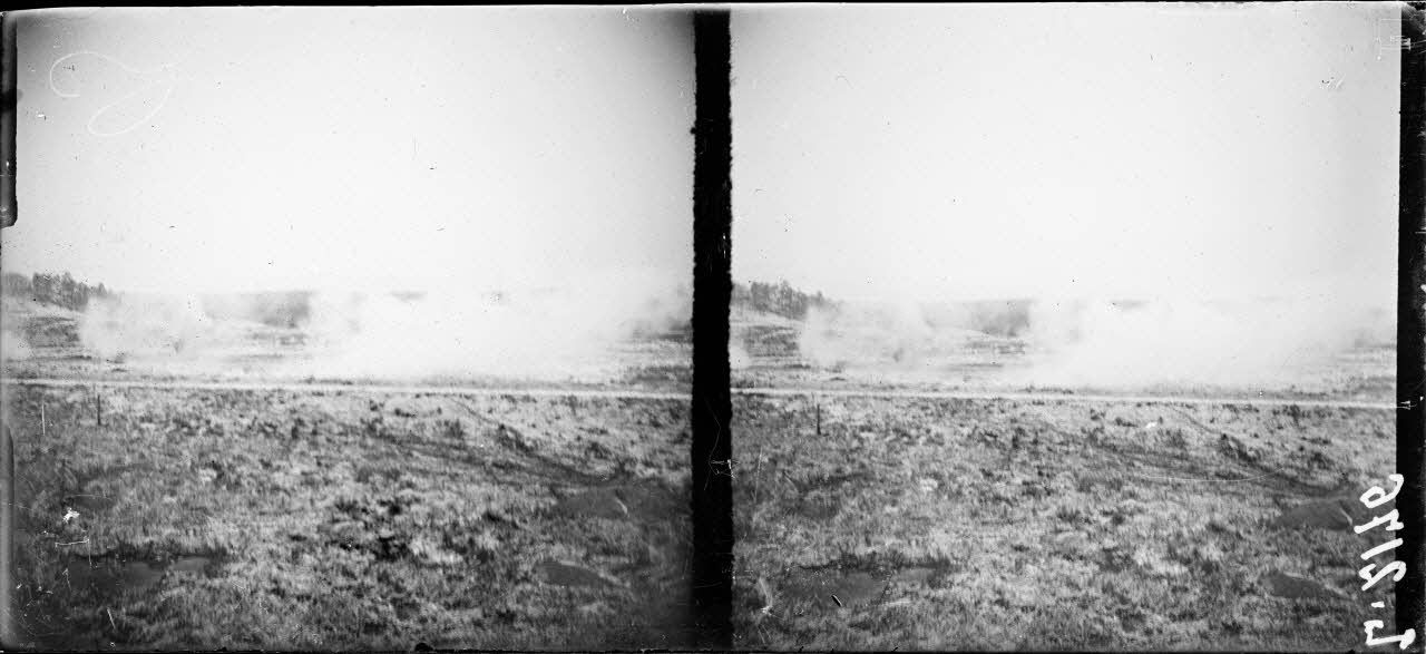 Fontainebleau. Seine et Marne. Expérience de tirs d'obus asphyxiants sur des tranchées avec chiens. Le gaz commence à couvrir le terrain.