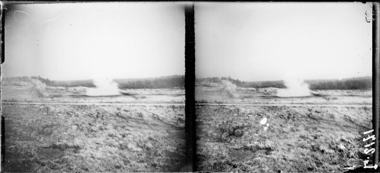 Fontainebleau. Seine et Marne. Expérience de tirs d'obus asphyxiants sur des tranchées avec chiens. Le gaz commence à couvrir le terrain.