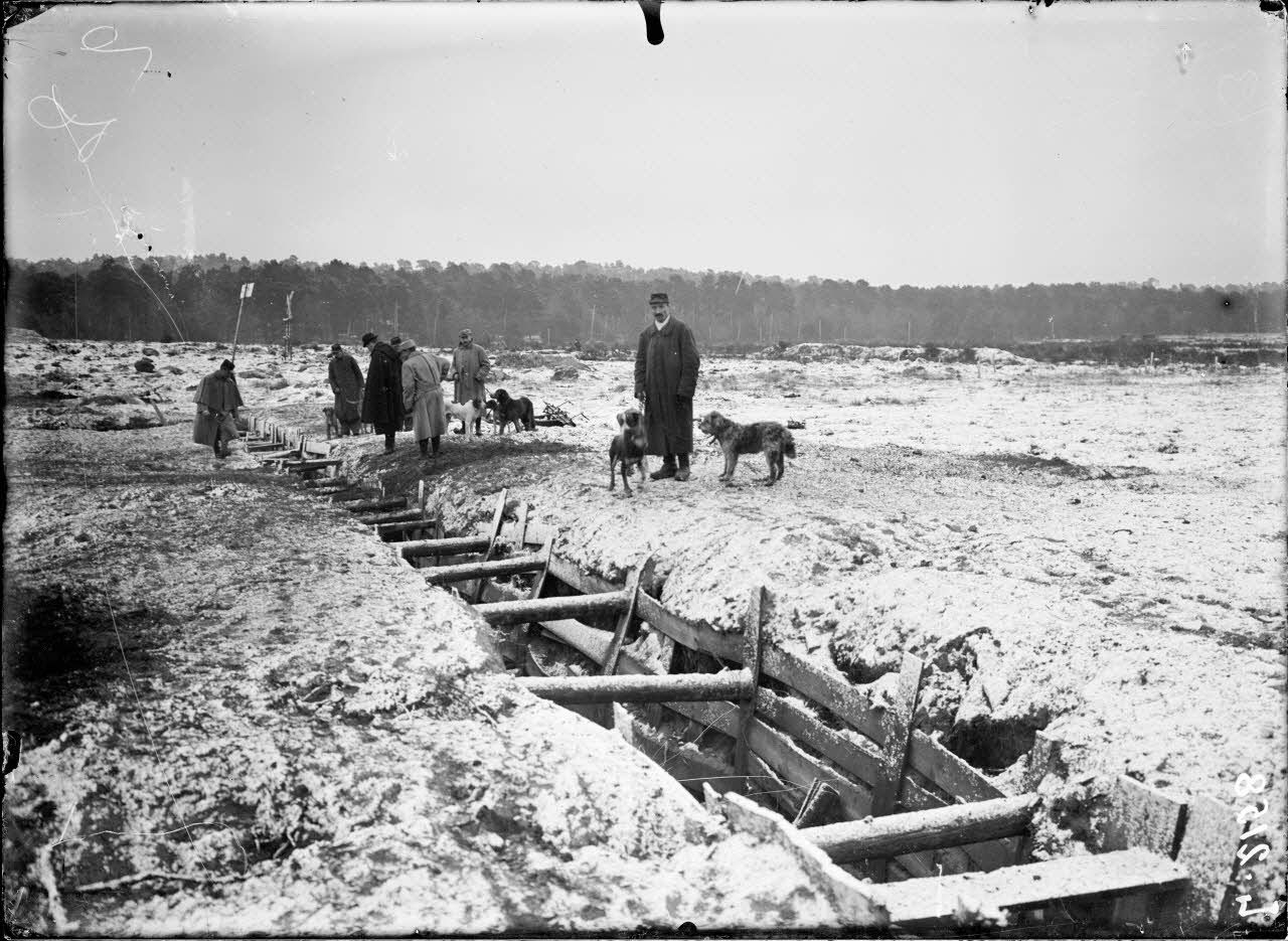 Fontainebleau. Seine et Marne. Expérience de tirs d'obus asphyxiants sur des tranchées avec chiens. Placement des chiens.