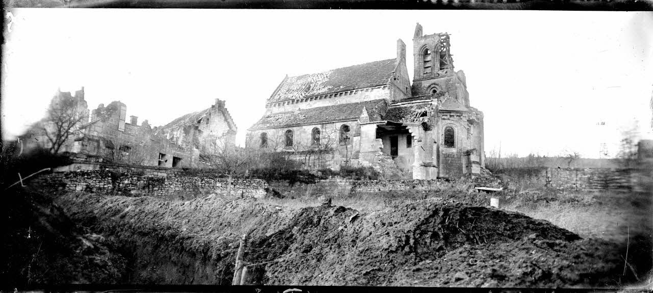 Fontenoy (Aisne). L'église côté ouest. Vue prise d'un boyau. [légende d'origine]