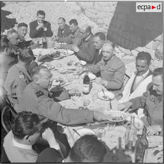 Forêt d'Akfadou. Poste du lieutenant Faure. Le général De Camas et le colonel Brunet pendant le repas.