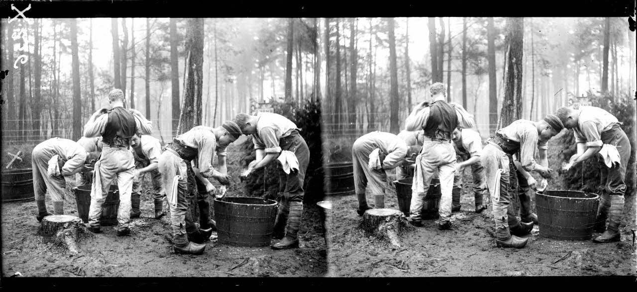 Forêt d'Orléans. Les Bordes. Campement de prisonniers. La toilette. [légende d'origine]