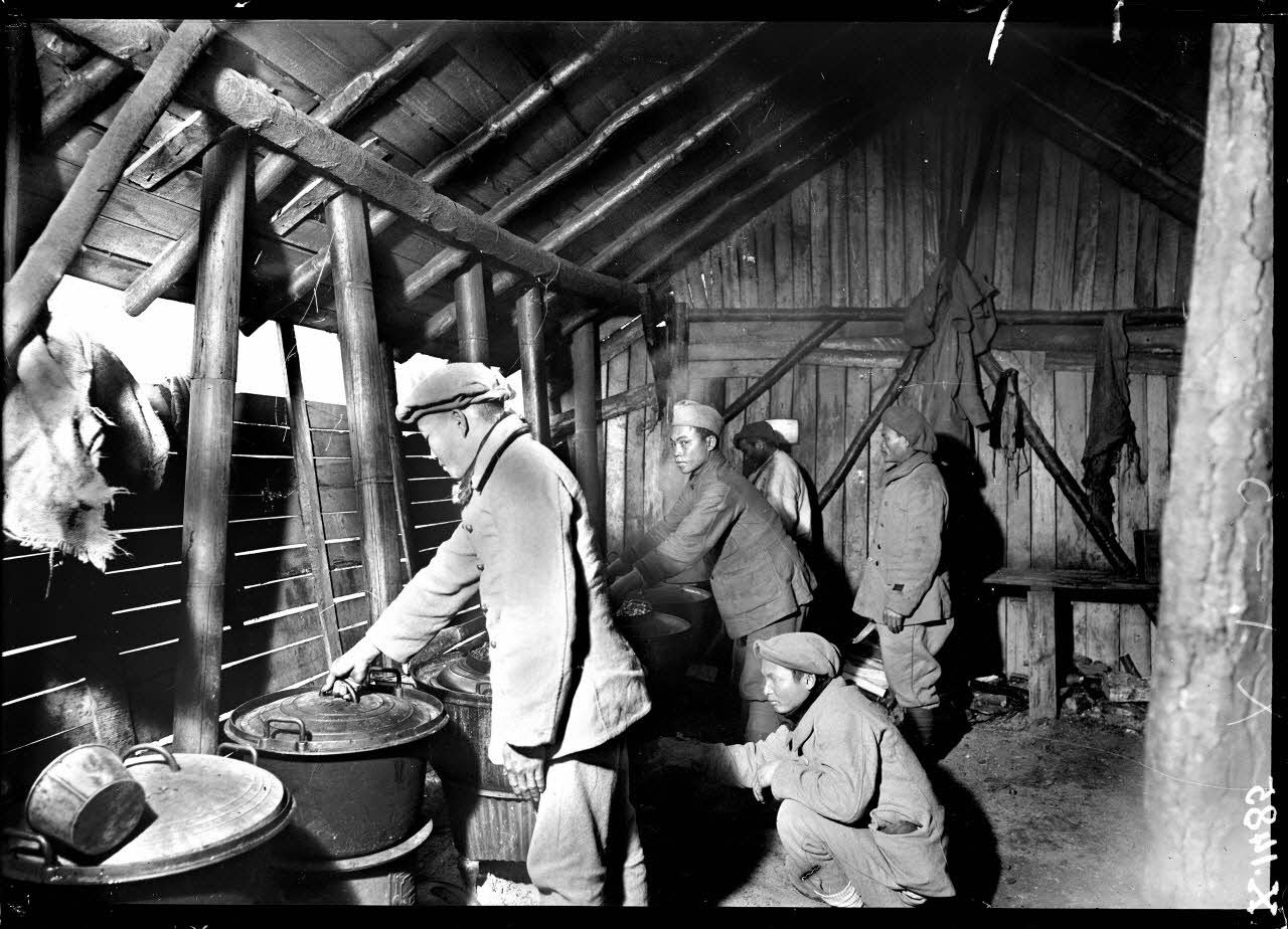 Forêt de Compiègne (Oise). Exploitation forestière par les Annamites. Au cantonnement des Annamites. La cuisine. [légende d'origine]