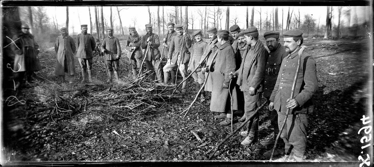 Forêt de Compiègne (Oise). Prisonniers allemands employés à l'abattage d'arbres. [légende d'origine]