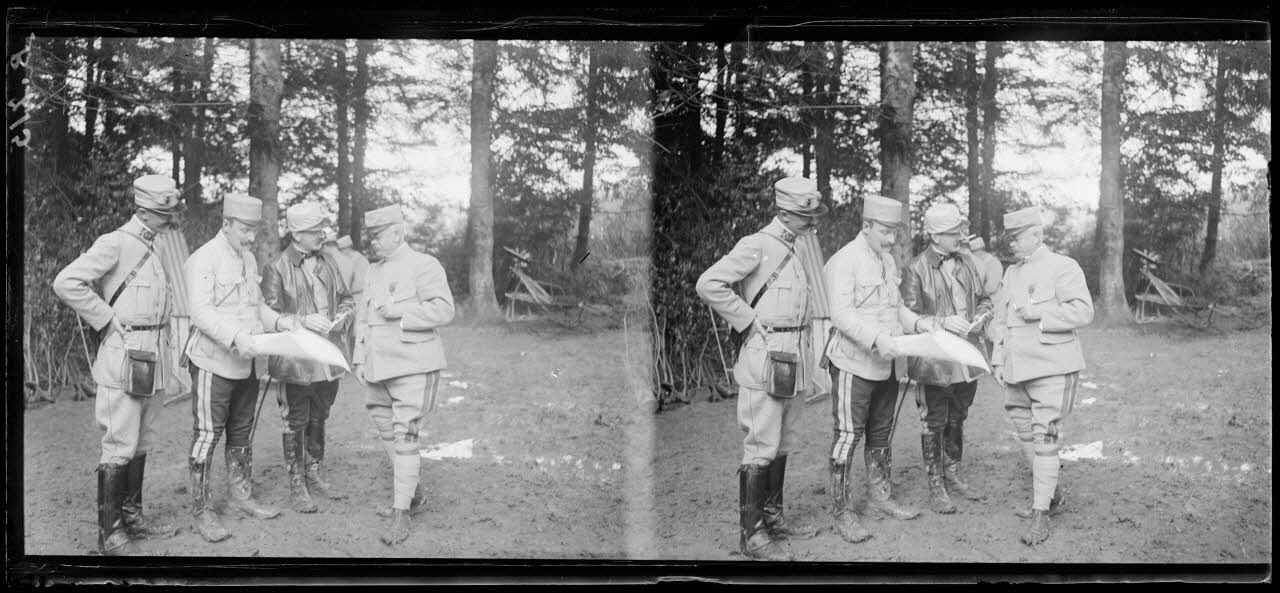 Forêt de Hesse. Pont des 4 enfants, général Bassenne et les officiers d'Etat major en conversation. [légende d'origine]
