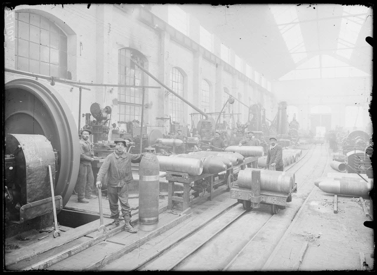 Forges et acieries électriques Paul Girod à Ugine (Savoie). Usinage des obus de 370. [légende d’origine]