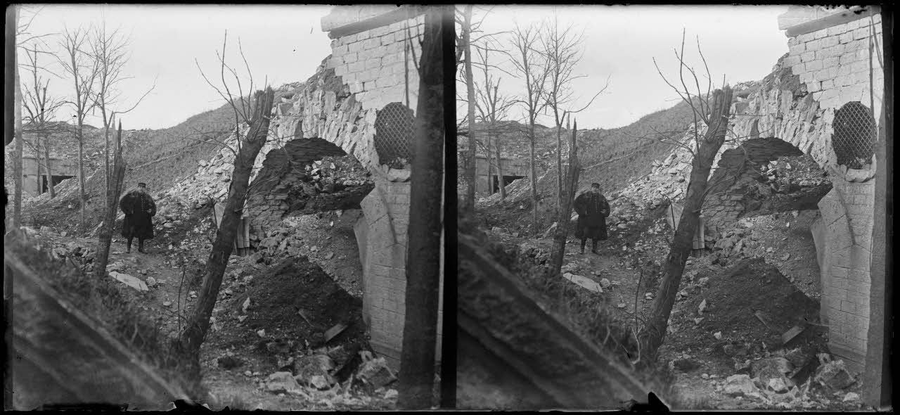 D169-2-17. [Quatre vues différentes sur une même plaque de verre du fort des Paroches, près de Saint-Mihiel dans la Meuse, et de ruines].