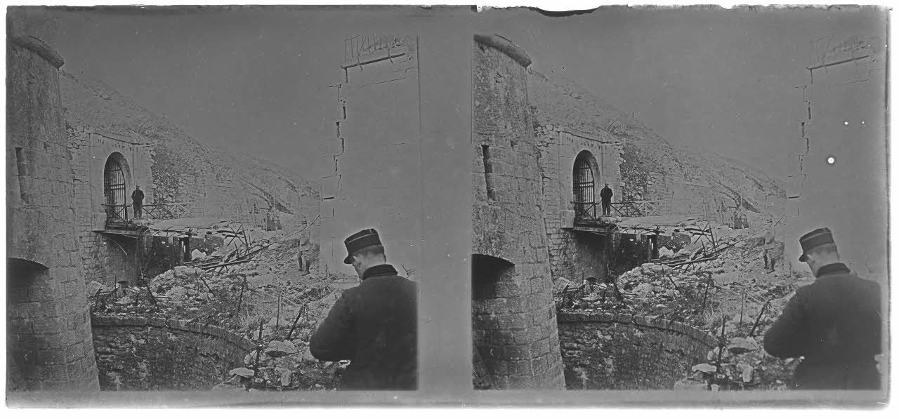 D169-2-17. [Quatre vues différentes sur une même plaque de verre du fort des Paroches, près de Saint-Mihiel dans la Meuse, et de ruines].