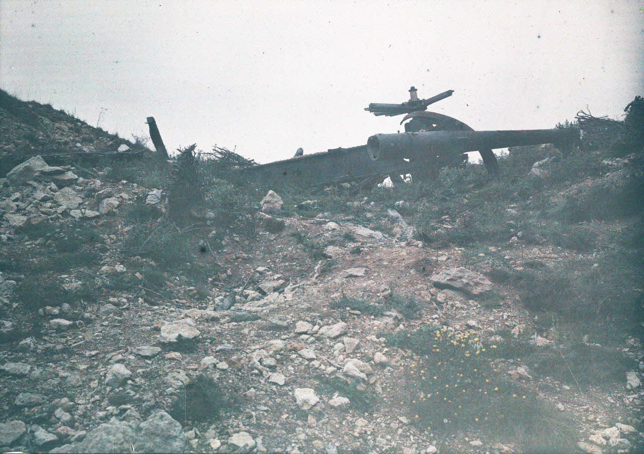 Note : correspond à l'autochrome oméga 71 de la liste figurant à la fin du registre de légendes ZN et dans le 3e livre d'entrées à la page 283. Auncune des deux sources ne mentionne la lettre code de l'opérateur. Cependant, début novembre v 1915, Pierre Machard prend un cliché en noir et blanc doté d'une légende très proche ( SPA 8 C 1087, "Fort de Liouville (Meuse). Pièce de 120 long enterré par l'explosion d'un obus allemand"). Il y a tout lieu de penser qu'il est également l'auteur de la présente autochrome.
