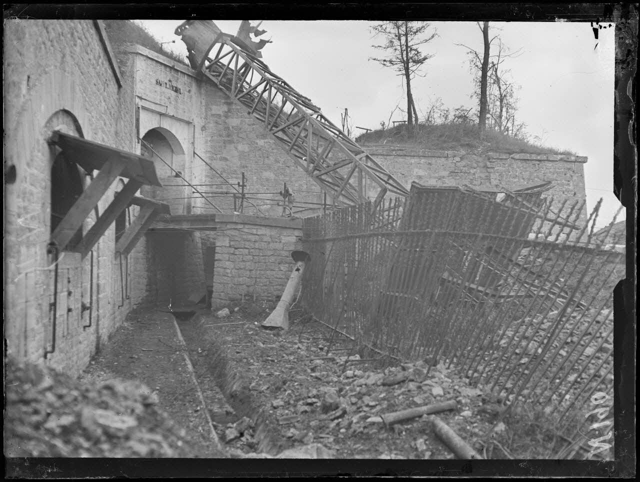 - Le fort Saint-Michel en ruines, avec ses portes détruites, un poste de téléphoniste sommairement installé, une batterie de 105 mm en action.