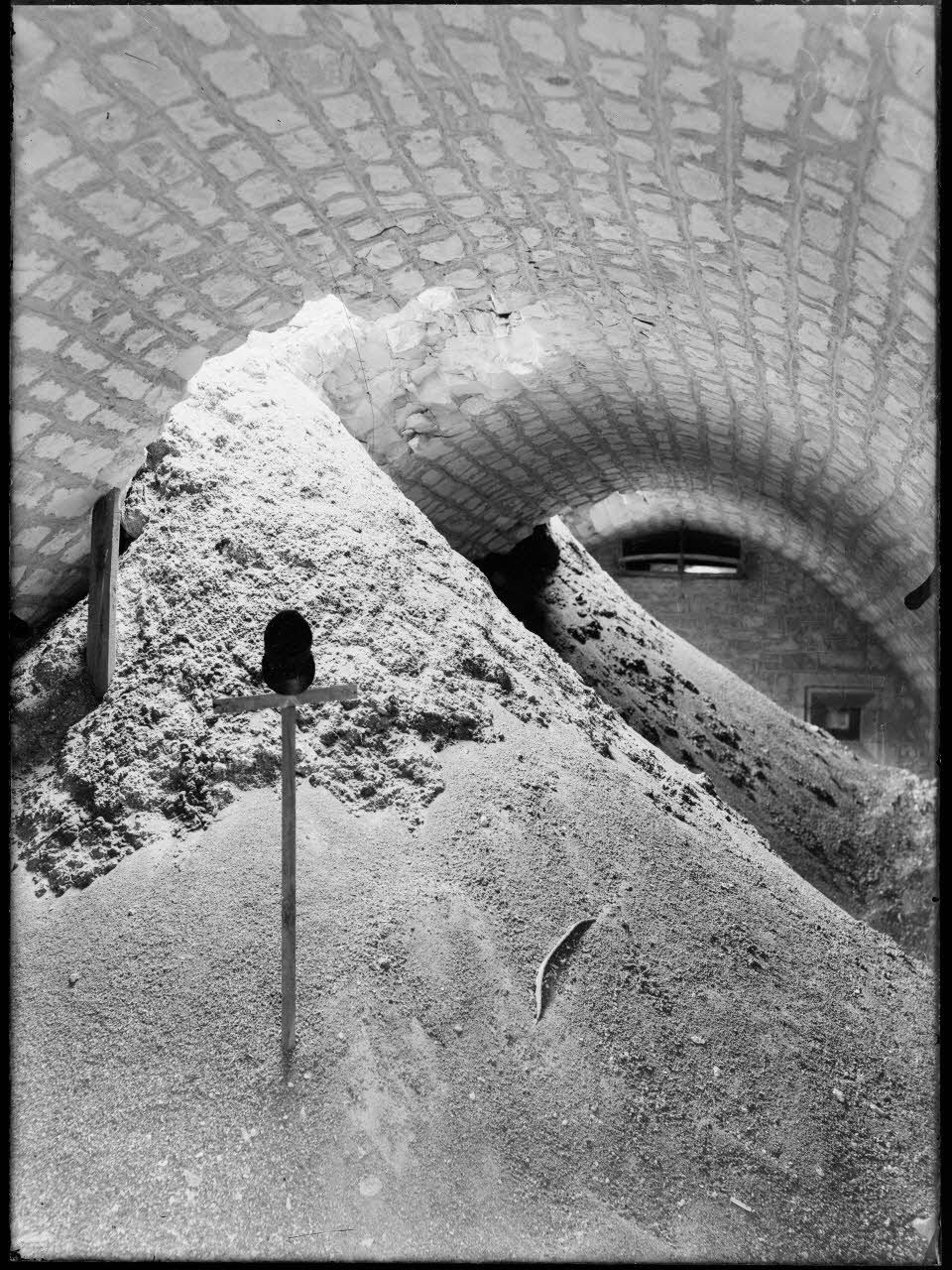 Fort de Troyon. Casemate centrale . 2 obus qui après avoir traversé la voûte ont déterminé un éboulement de terre, qui a enterré vivants 30 soldats du 166e d'infanterie qui sont encore sous les décombres. [légende d'origine]