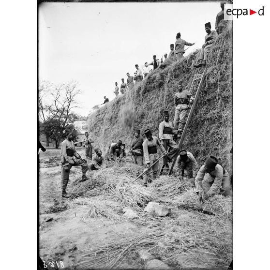 La "station-magasin" du fort de Vincennes emploie de nombreux travailleurs malgaches et est gardée par une compagnie du 24e RI (24e régiment d'infanterie) dont on voit des éléments sur presque tous les clichés.