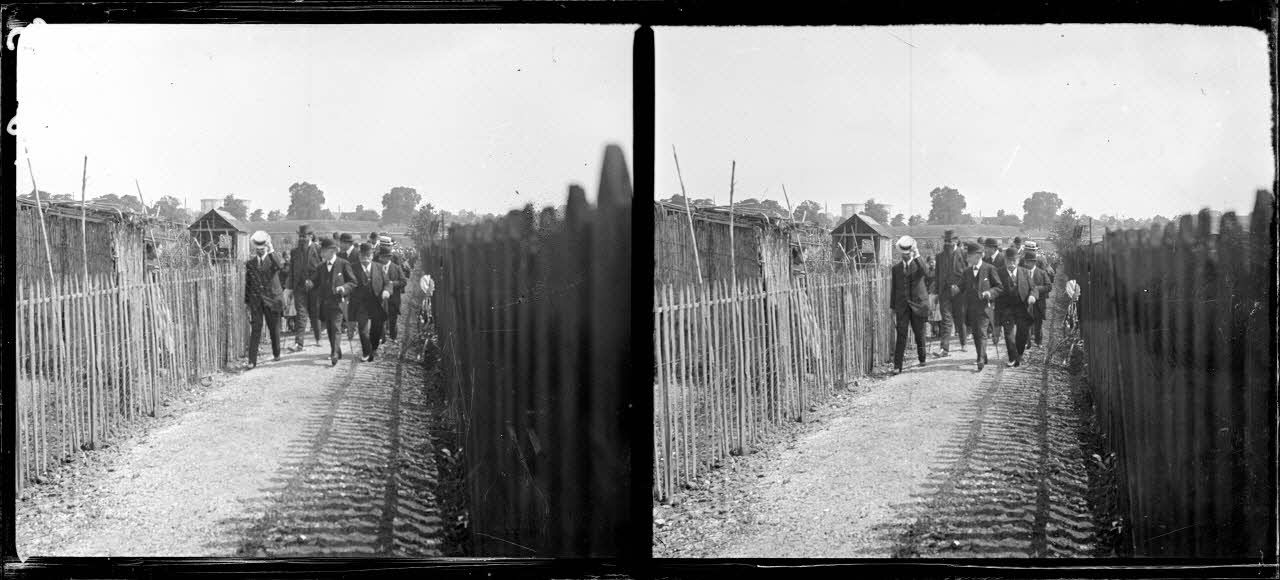 Fortifications de Bercy (Seine). Visite du Lot 2 de culture des fortifications avec M. Sabot? maire du XIIème arrondissement, M. Dubocq, maire adjoint, M. Adenis, président du Comité. [légende d'origine]