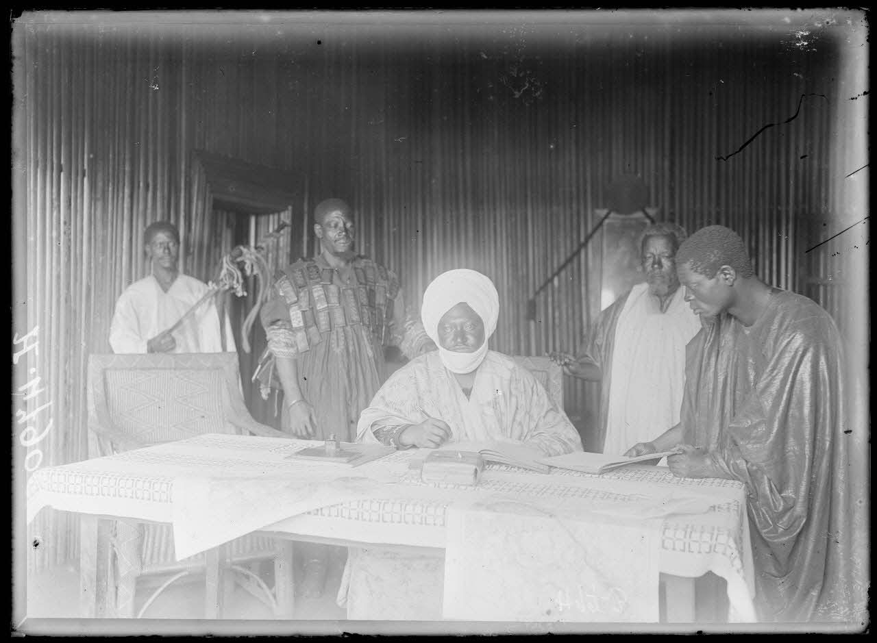 Le roir Njoya, sultan des Bamoun, écrit à sa table de travail, entouré de ses conseillers.
