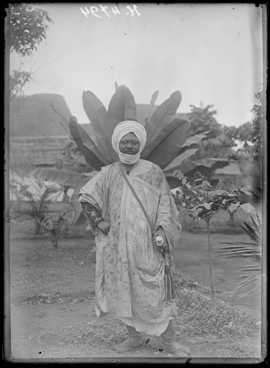 Le roi Njoya, sultan des Bamoun, s'apprête à rendre la justice en habit traditionnel.