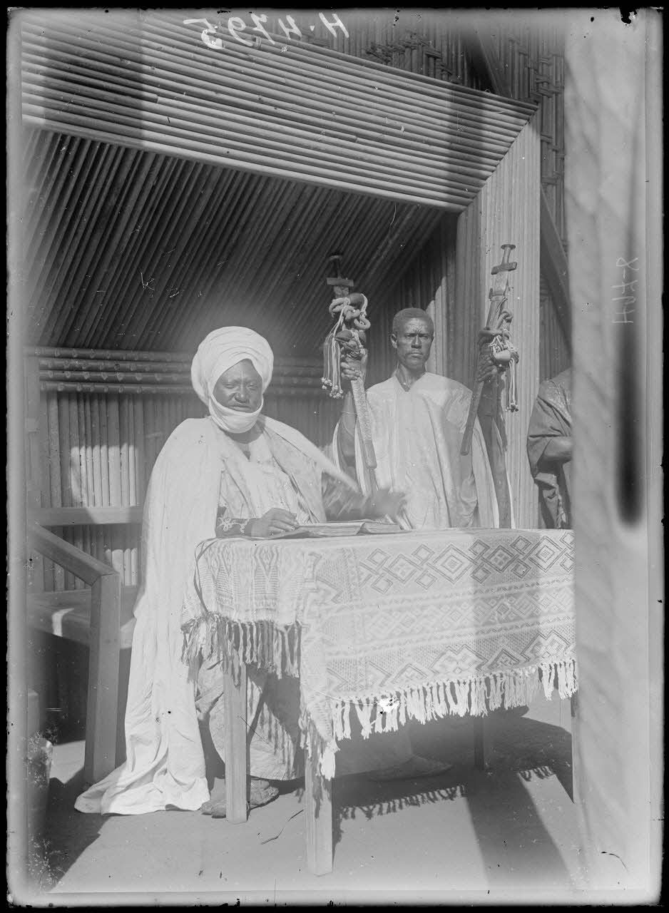 Le roi Njoya, sultan des Bamoun, rend la justice à l'entrée de son palais, sur une table couverte d'un riche tissu. Un serviteur tient au-dessus de lui deux épées dans leur foureau.