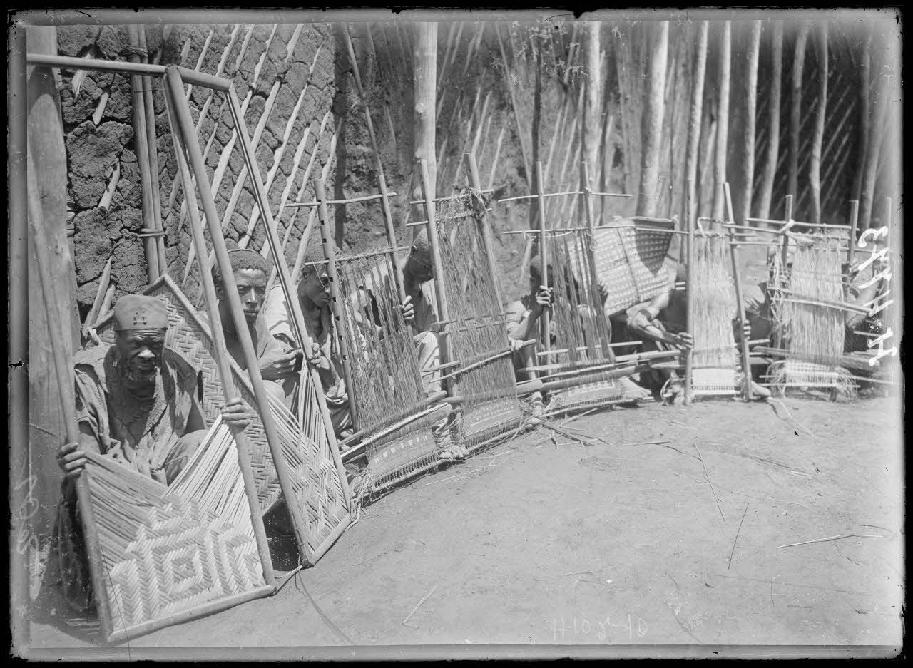Foumban. Ouvriers tissant des nattes en fibre de ban. [légende d'origine]