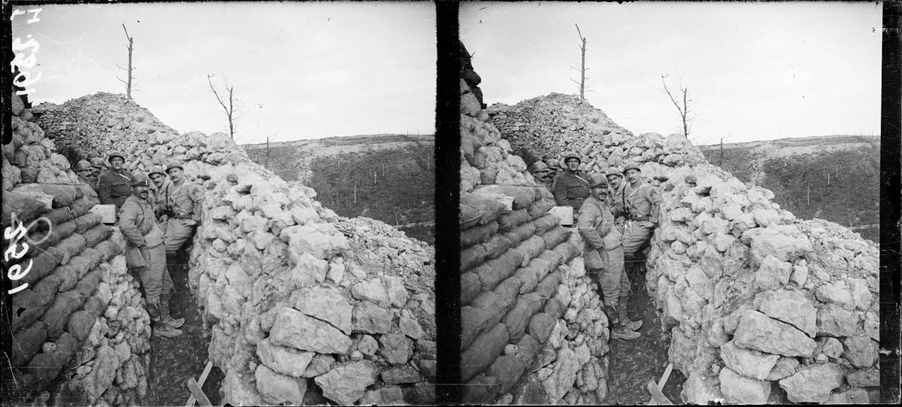 - au Four-de-Paris, des soldats dans une tranchée, en contre-bas la forêt détruite (SPA 55 L 2591), devant le PC (poste de commandement) du commandant Vielzeux, un fusil Lebel modèle 1886 modifié 1893 monté sur un socle en bois afin de l'utiliser comme lance-grenade (seul fusil apte à supporter le choc de départ), sans son accessoire (le Tromblon VB, Viven-Bessières, SPA 55 L 2592), le commandant Vielzeux et ses officiers près de la 3e tranchée (SPA 55 L 2593), une ferme et les fortifications adjacentes faites de gabions, SPA 55 L 2598 ;