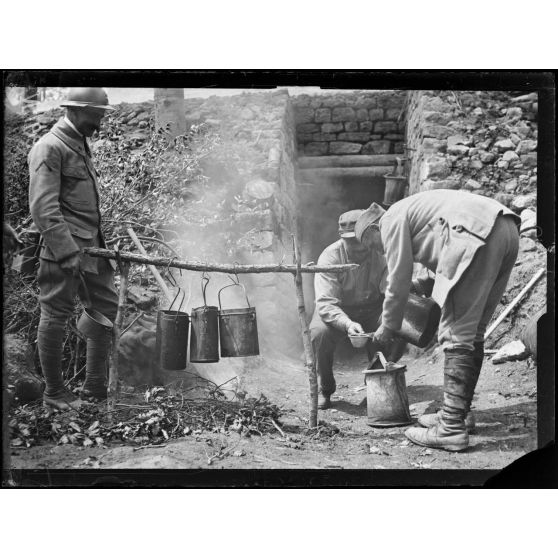 - Dans le bois de Lachalade, les cantonnements et abris de première et seconde ligne acceuillent les soldats, le café, le perruquier, le poste d'air comprimé, l'arrivée de la soupe aux tranchées, l'entrée d'une sape, un poste d'écoute installé dans un cratère d'obus, les lignes allemandes à 10 mètres, la cote 285, le PC du commandant Tissier, le cimetière du Four des Moines, l'ouvrage Garnier installé sur le secteur de la Haute Chevauchée, le PC du 82e régiment d'infanterie installé près de la crête de la Fille Morte, un cours théorique sur le tir contre avion à la mitrailleuse.