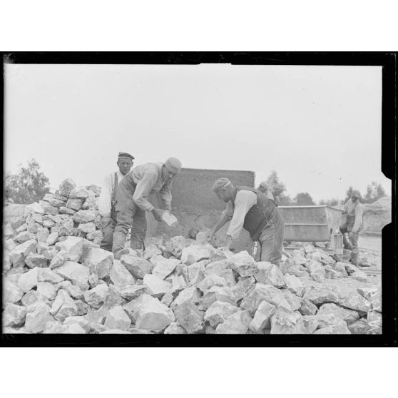- À Vadelaincourt, des prisonniers allemands au travail dans une carrière d'où l'on extraie des pierres pour l'entretien de la Voie Sacrée.