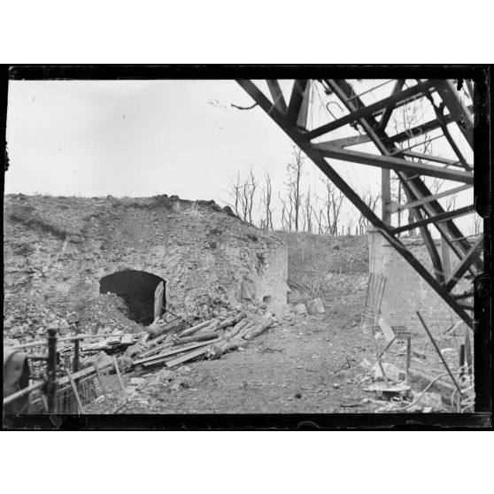 - Le fort Saint-Michel en ruines, avec ses portes détruites, un poste de téléphoniste sommairement installé, une batterie de 105 mm en action.