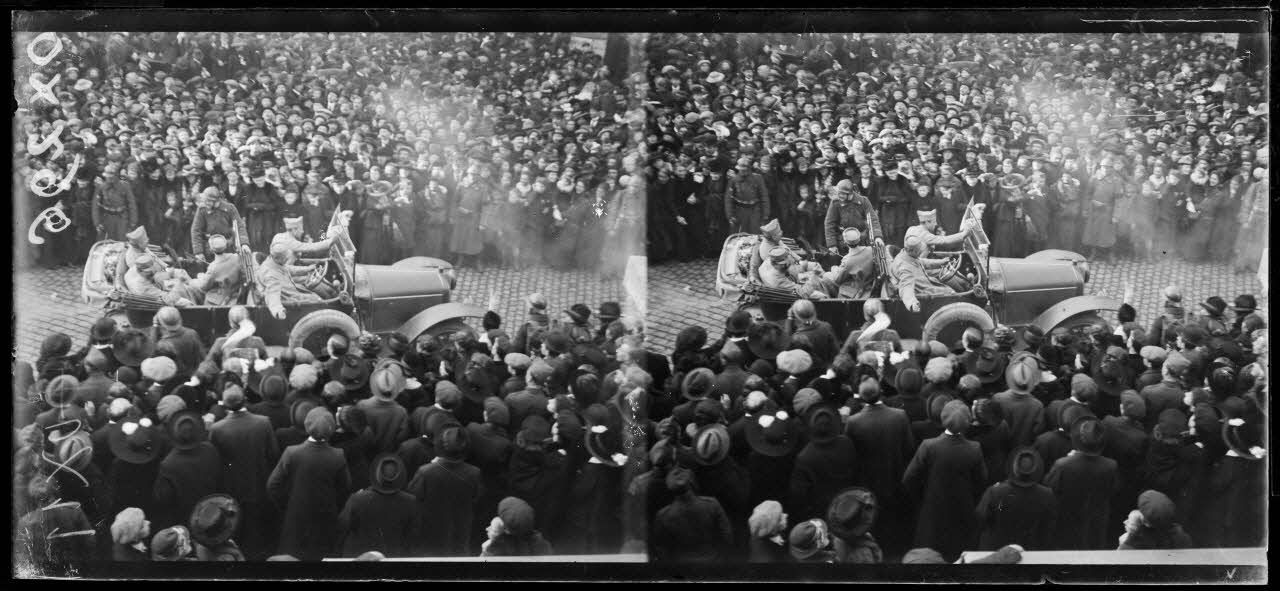 Durant l'offensive des Alliés, la ville de Gand est libérée le 11 novembre 1918. L'entrée des souverains belges dans la ville, suivie du défilé de l'artillerie, est acclamée par la foule.