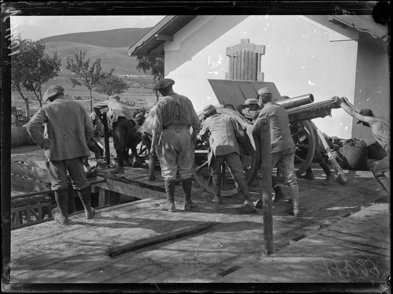 Gare d'Eksim. Déchargement de pièces de 105 et de 120. [légende d'origine]