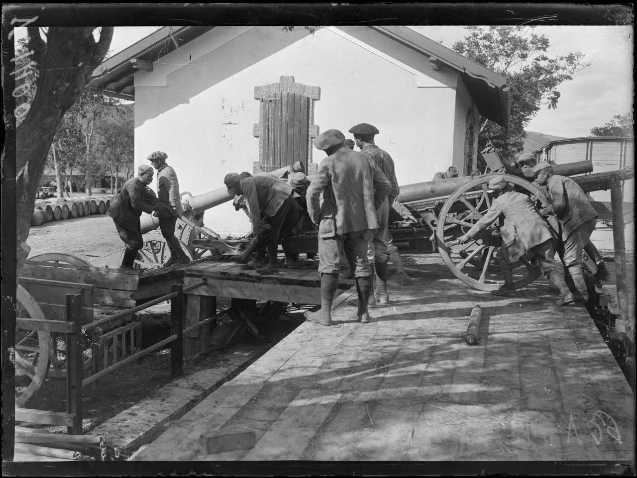 Gare d'Eksim. Déchargement de pièces de 105 et de 120. [légende d'origine]