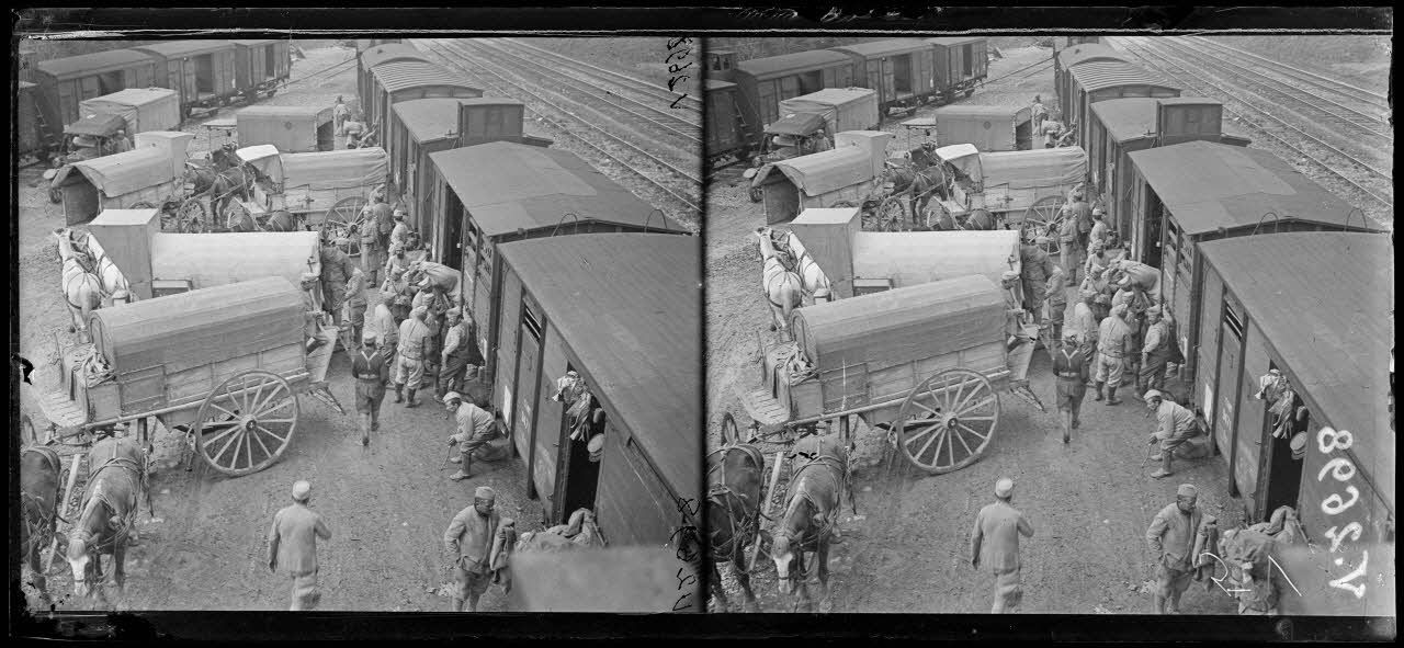 - A la gare de ravitaillement de Fontaine-Bonneleau, (Oise, 08/05/1918, V 2697 à V 2699) le ravitaillement alimentaire est déchargé des wagons pour être acheminé vers le front.