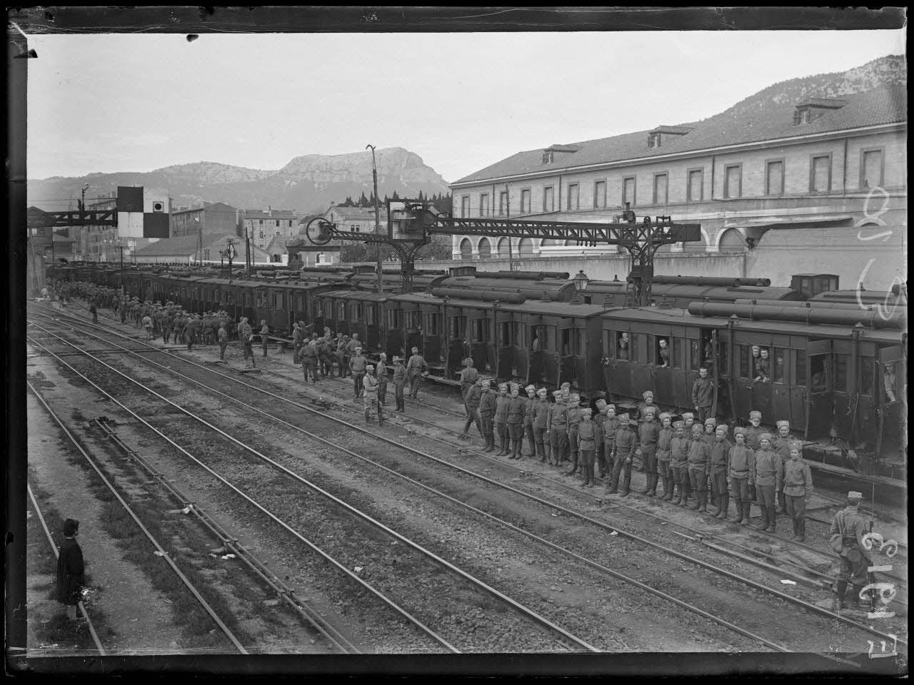 Gare de Toulon. Les soldats russes pendant l'arrêt du train.
