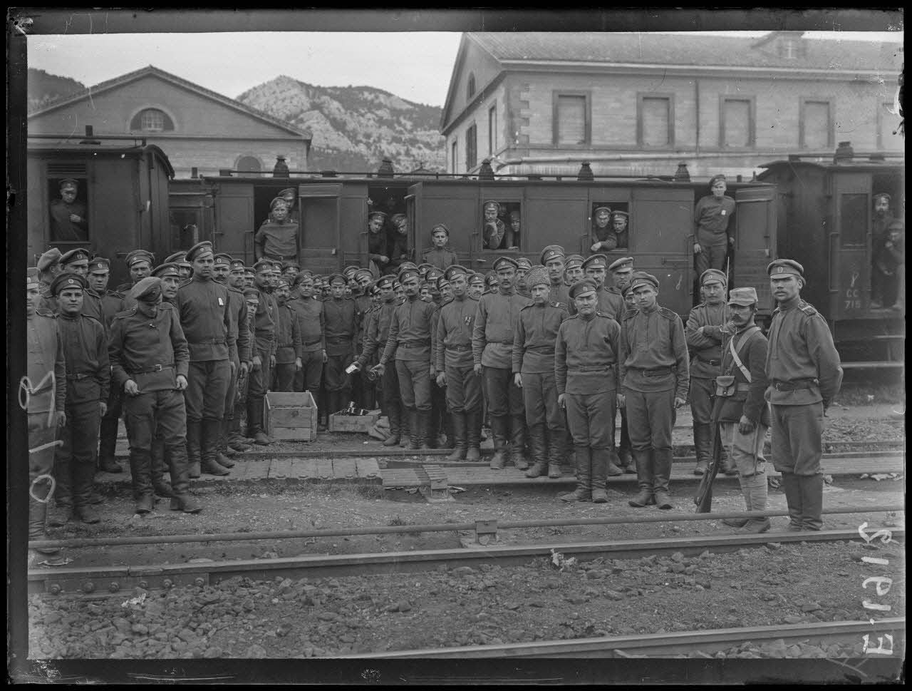 Un train transportant des soldats russes arrive en gare de Toulon.