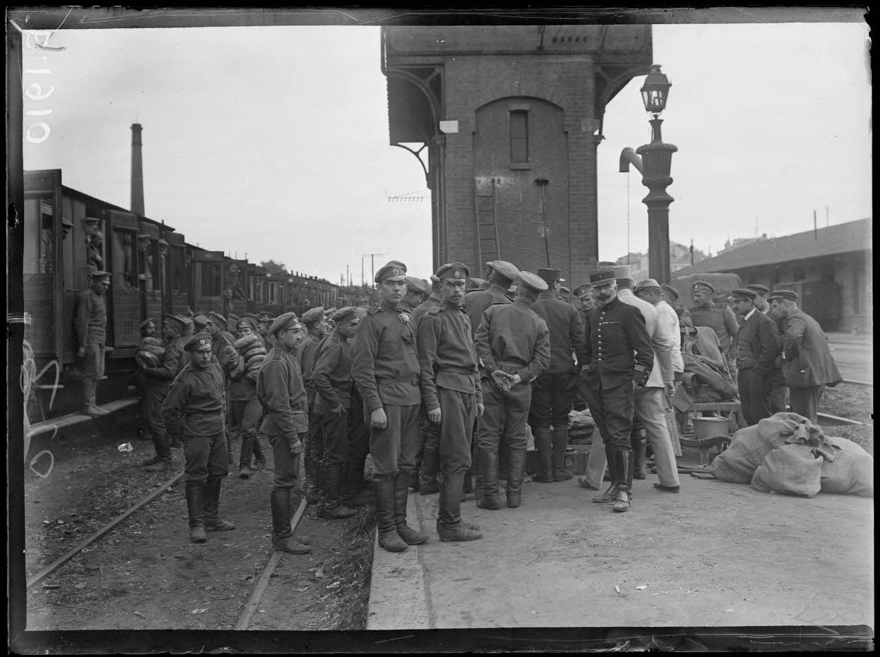 Gare de Toulon. Les soldats russes pendant l'arrêt du train.
