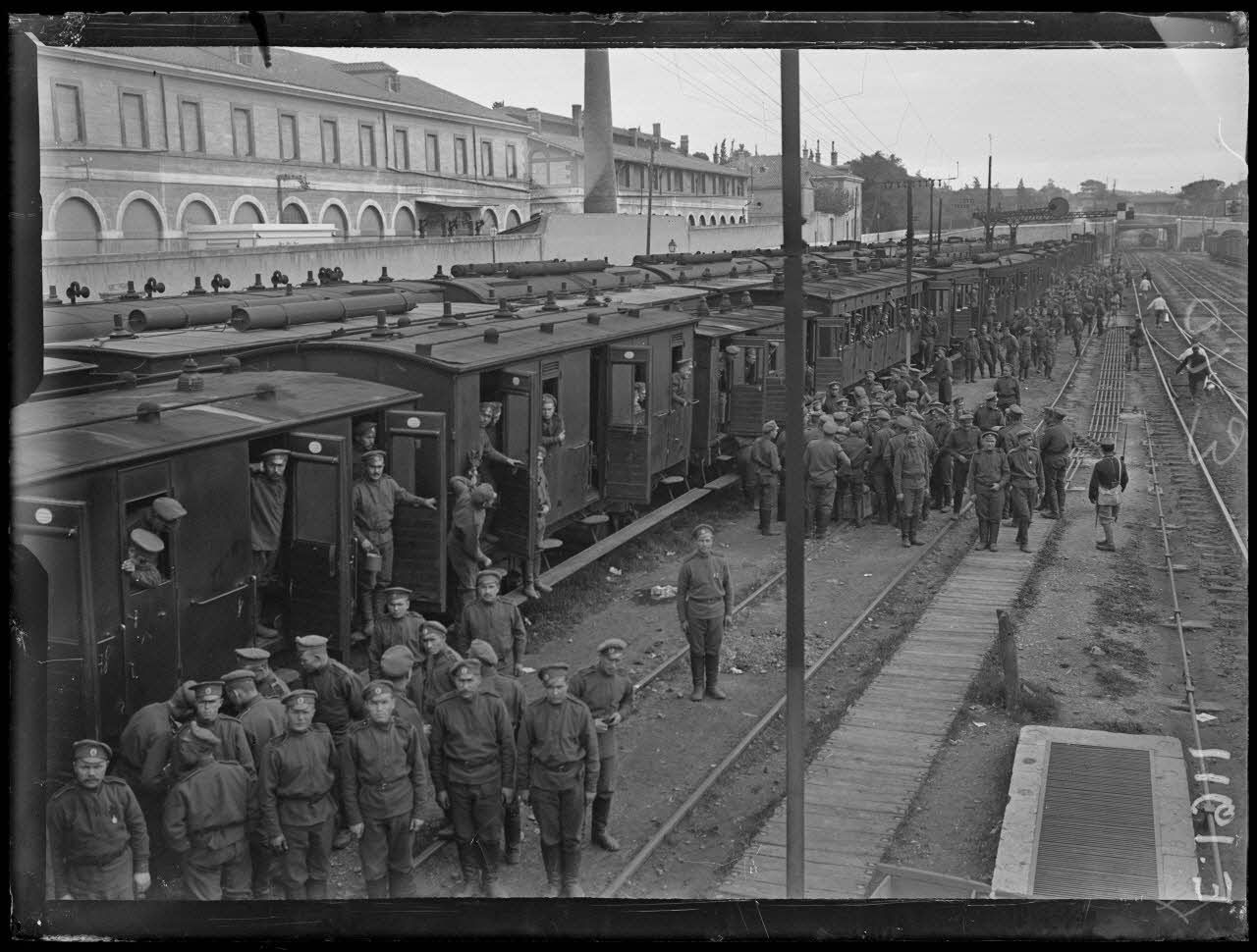 Gare de Toulon. Les soldats russes pendant l'arrêt du train.
