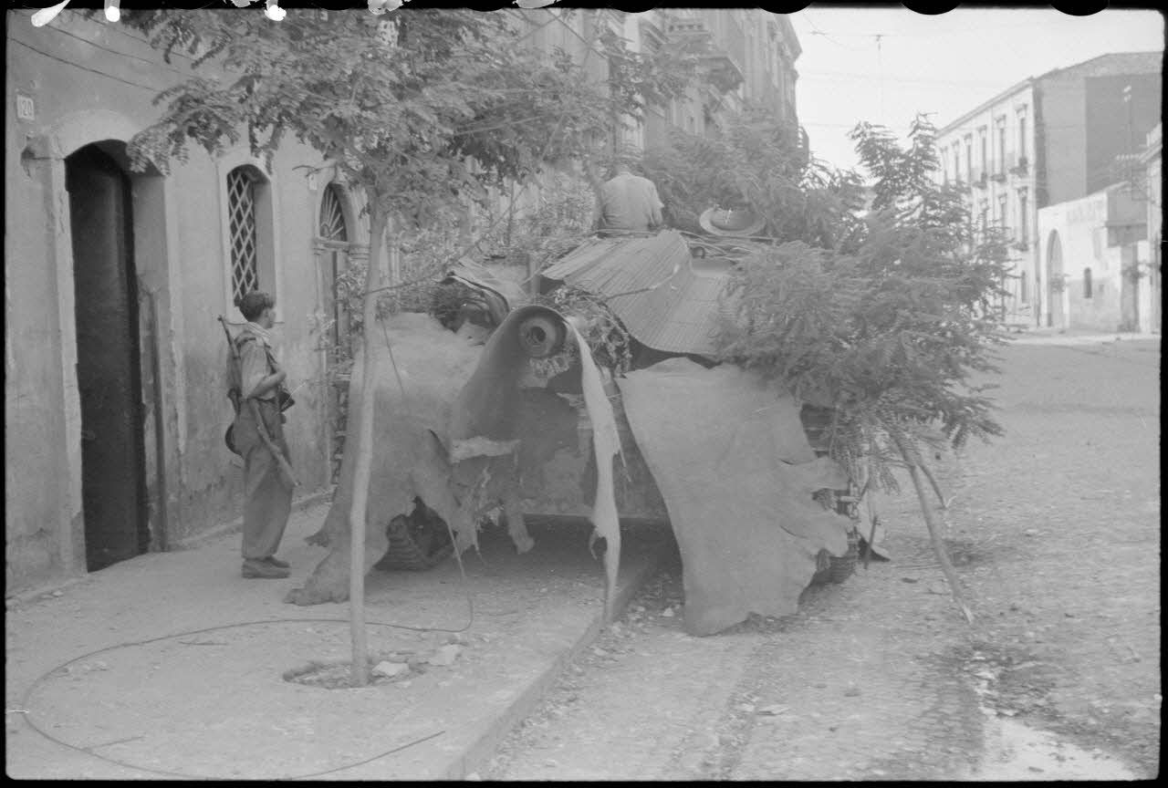Garé ou embusqué sur un trottoir, le long des habitations, un Sturmgeschütz III de la III./Panzer-Regiment Hermann Goering est recouvert d'une tôle ondulée ou caoutchoutée, d'une paillasse et de branches.