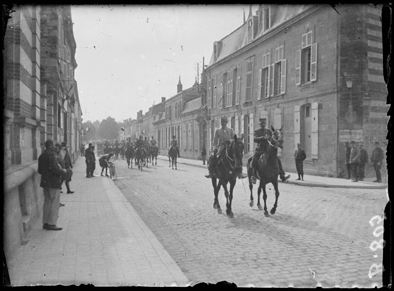 Général Humbert, commandant la 3e armée venant de passer en revue le 151e de ligne, traverse Ste Menehould avec son escorte. [légende d’origine]