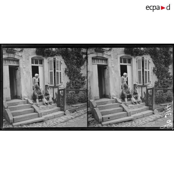 Gondrecourt, camp américain, soldats américains causant avec deux vieilles femmes du pays.