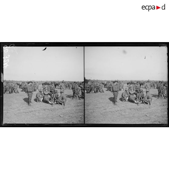 Demange, terrain de manoeuvres des troupes américaines. Emploi des mitrailleuses avec des équipes mixtes d'américains et de chasseurs alpins.