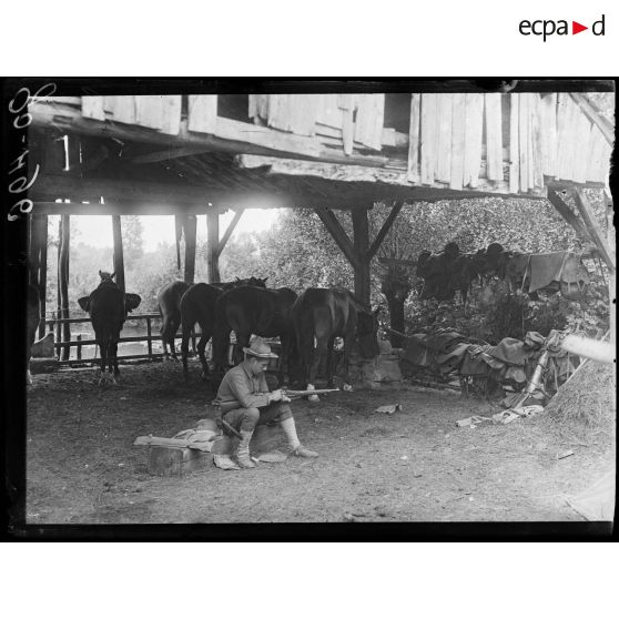 - les soins apportés aux mulets, le ferrage, l'apport de nourriture, les diverses corvées d'un cantonnement, abattage d'arbres, préparation de repas, distribution des repas, construction de baraquements ;