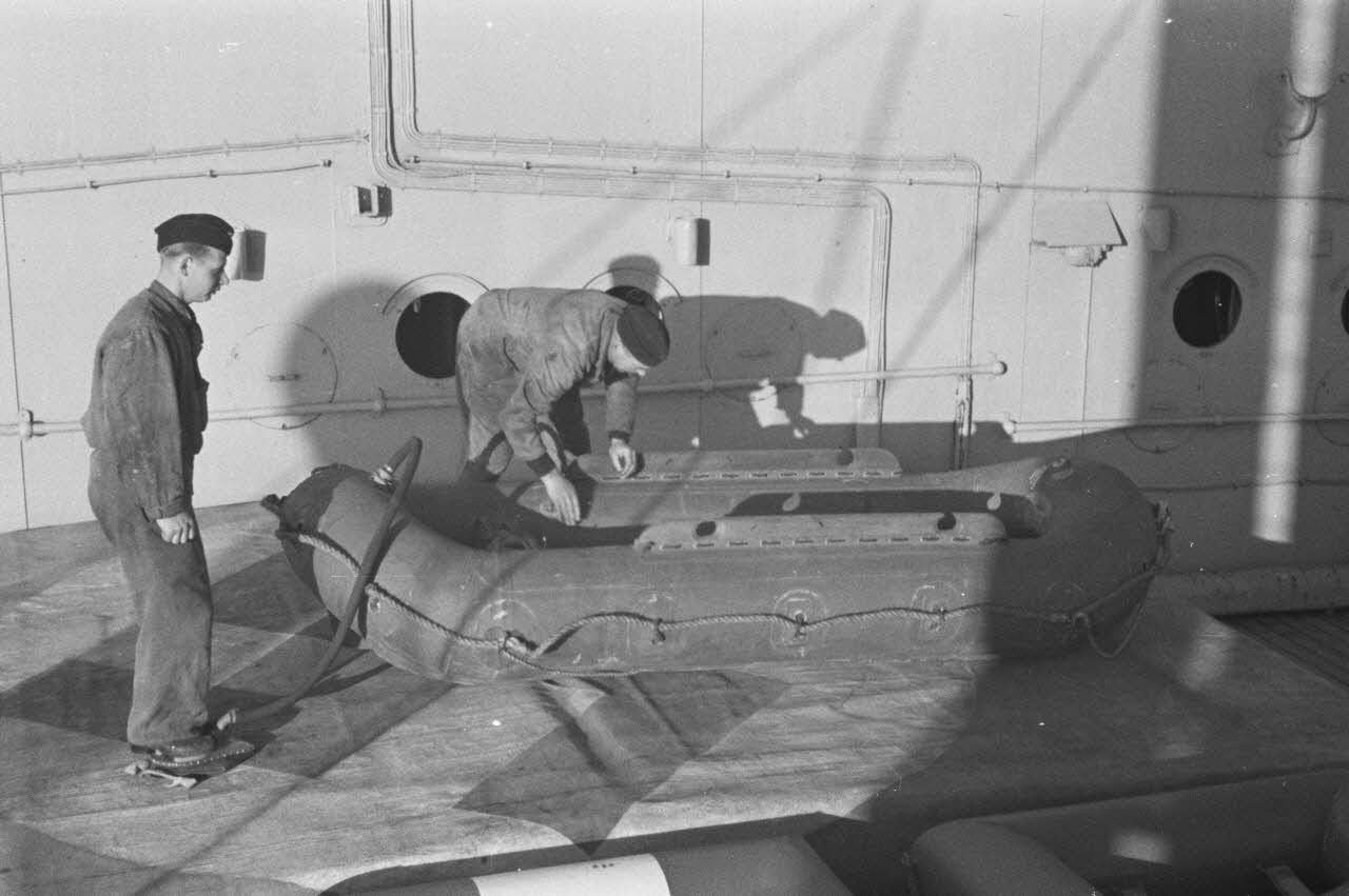 Gonflage d'un bateau de sauvetage à bord du dragueur de mines allemand surnommé briseur de blocus (Sperrbrecher).