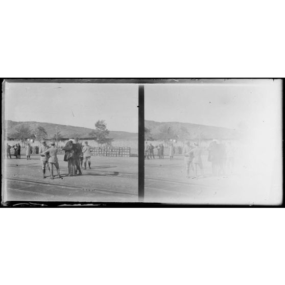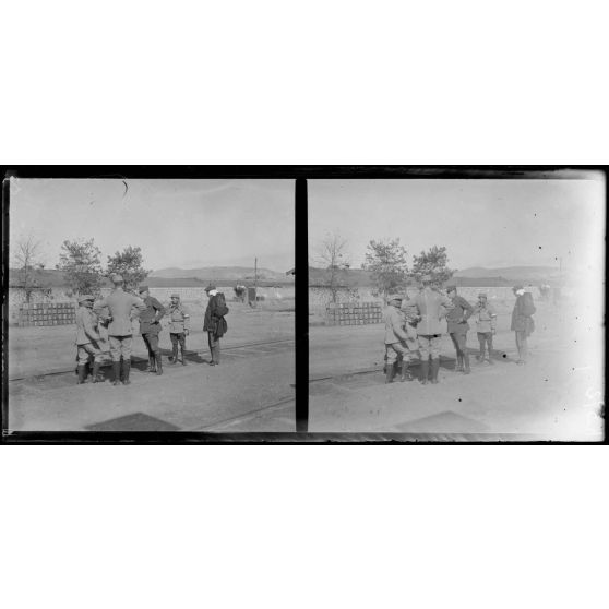 Krivolak. La gare pendant le bombardement. Le général Sarrail, un général de brigade, un officier serbe et un interprète.
