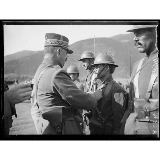 Route de Bohémica. A l'Arbre Noir, revue du 5eme régiment d'infanterie grecque, le Général Franchet d'Espèrey décore des soldats grecs.