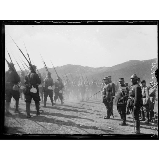 Route de Bohémica. A l'Arbre Noir, revue du 5eme régiment d'infanterie grecque, le défilé, le Général Franchet d'Espèrey salue les troupes.