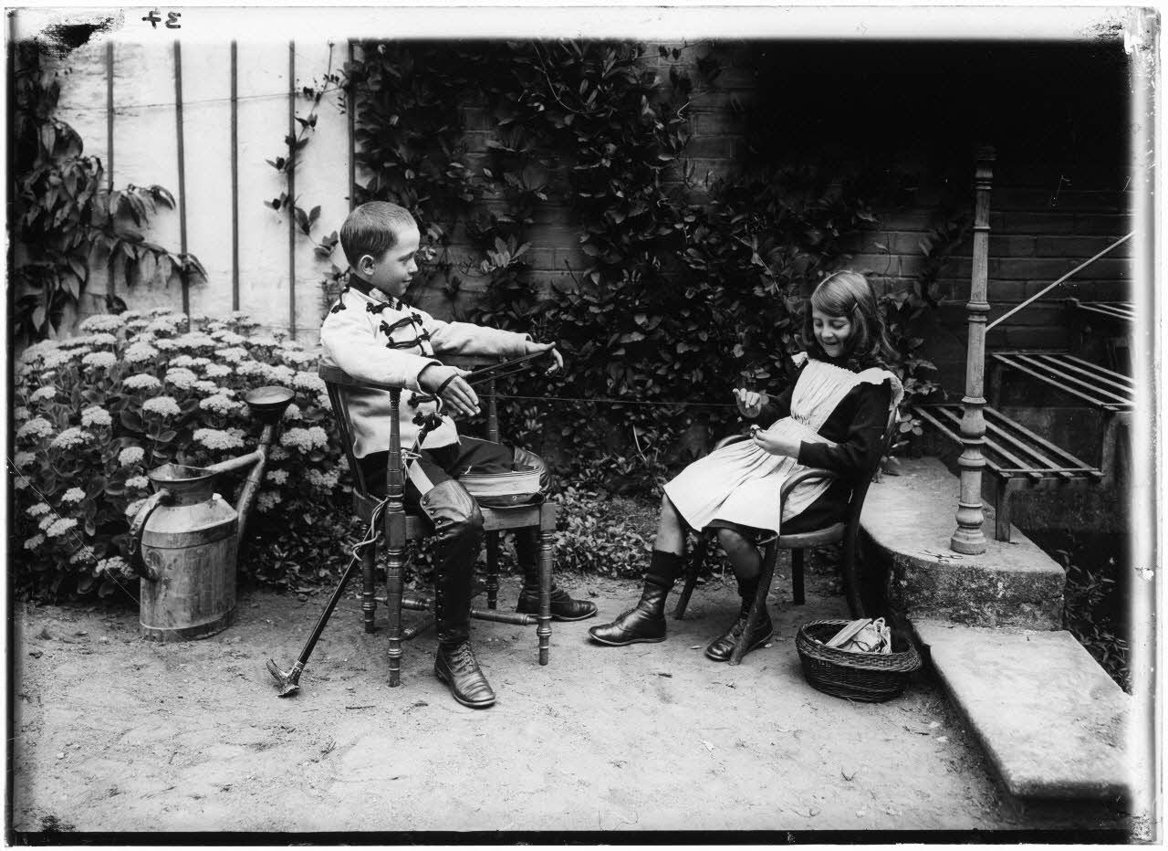 Deux enfants dans un jardin jouent à imiter des grandes personnes. L'ECPAD est le détenteur des droits patrimoniaux afférents à ces photographies, oeuvres de Jean-Baptiste Tournassoud, qui tomberont dans le domaine public le 1er janvier 2023.