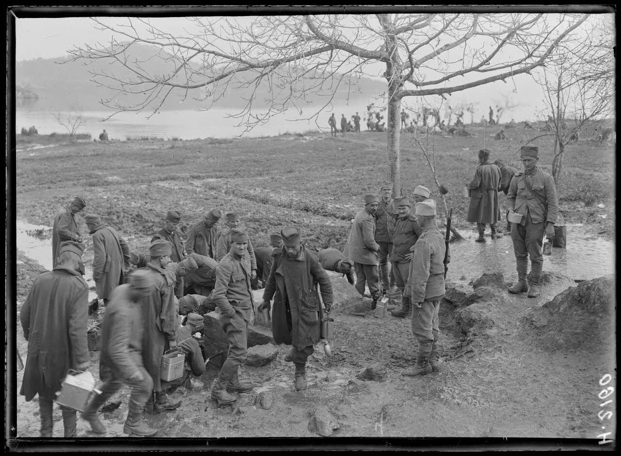 Sur les quais, des soldats serbes sont vaccinés contre le choléra. Une baraque Adrian (construction provisoire en bois et métal) longue de 46 mètres sert de magasin d'artillerie.