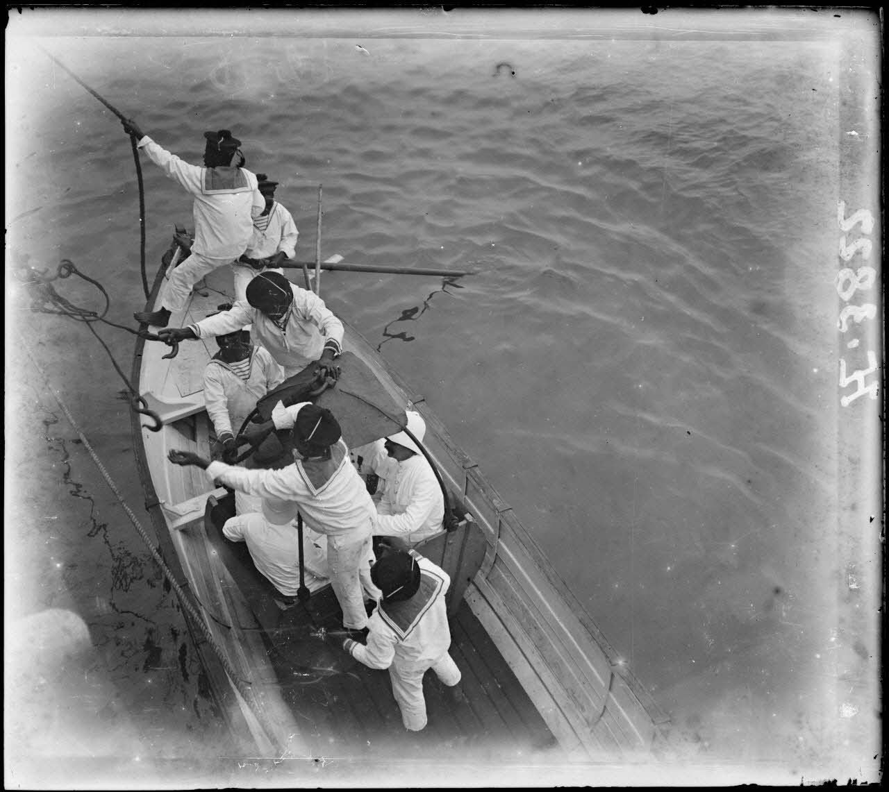 Lors de l'escale de Tabou, des équipages de Kroumen rejoignent le navire à bord de plusieurs barques.